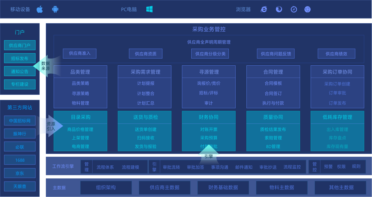 (1)电子采购平台需要实现多个采购单位的采购业务在一个系统平台实现,支持多种采购管理业务流程,具备支持多法人、多需求单元、多采购组织、多库存地的采购,实现集团高效采购、阳光采购、集中管理的目标。