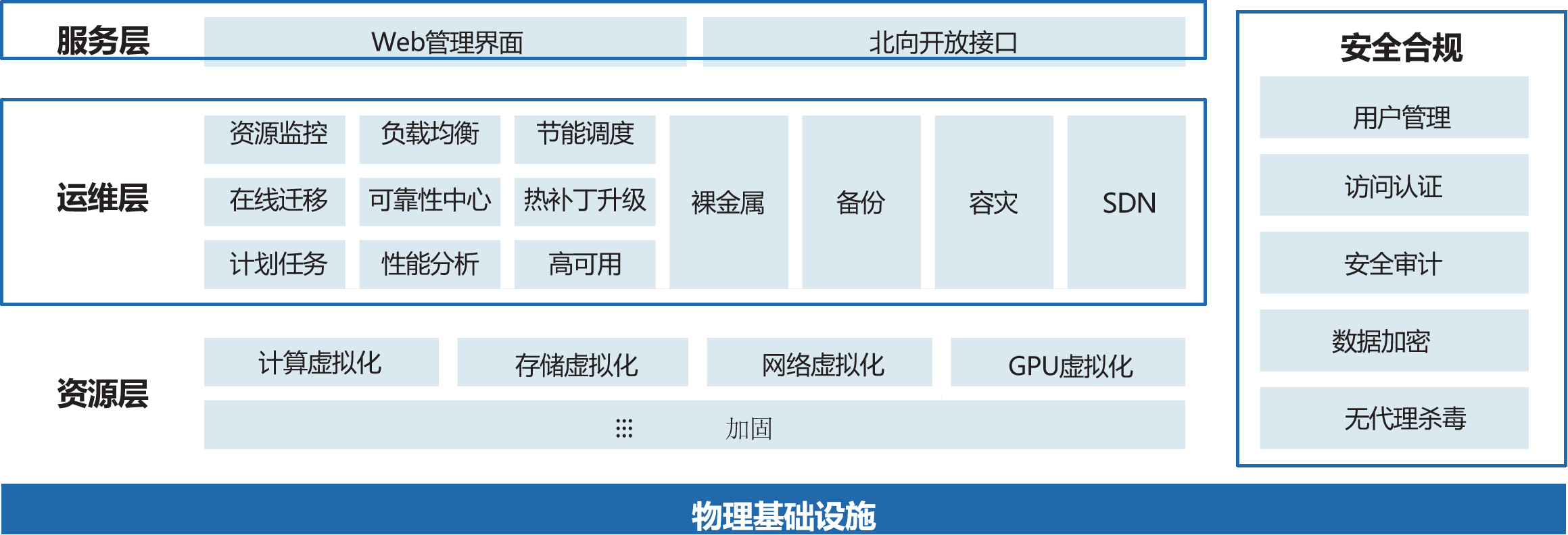 基于同源异构能力,给予一云多芯多算,多资源融合管理:同一集群混合部署异构CPU、GPU算力,屏蔽底层硬件差异实现资源池化、异构迁移;虚拟机、裸金属、容器等资源同池共管,ALL IN ONE管理界面实现部署、运维、监控、改扩配,运维更精简、管理更统一。